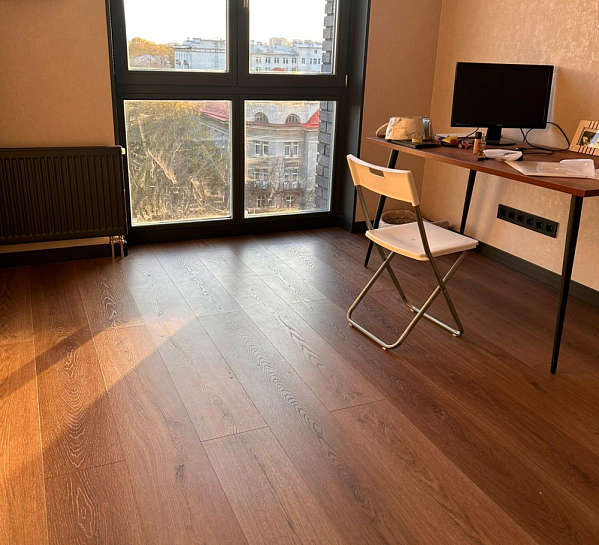 ◻️ Наличие слоя натурального шпона дерева толщиной 0,6 мм делает пол неотличимым от настоящего паркета, а устойчивость поверхности к выгоранию и механическим повреждениям обеспечивают 7 слоев UV-лака.