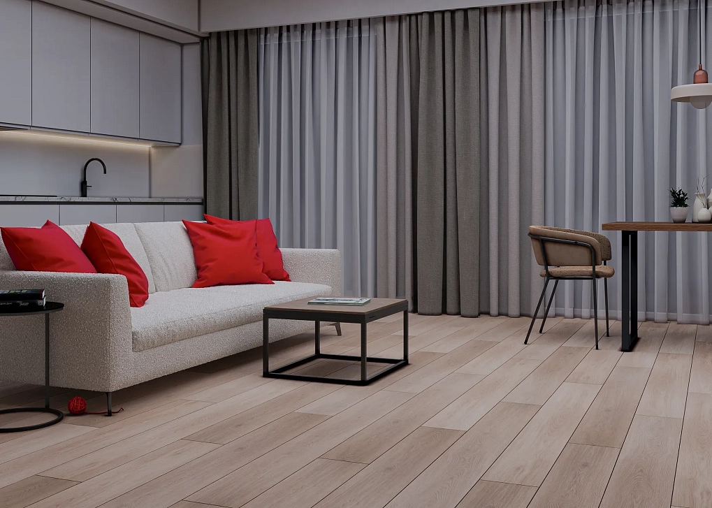 Планка формата 1545×180 мм с аккуратной фаской 4V создаёт аккуратное полотно и визуально вытягивает пространство. Общая толщина 6 мм дополнена встроенной подложкой IXPE 1 мм — шаг становится мягче, снижается уровень шума, а монтаж проходит быстрее. Замковое соединение Click обеспечивает плотную стыковку без щелей и позволяет укладывать 1,67 м² из одной упаковки (6 планок, вес около 18 кг).